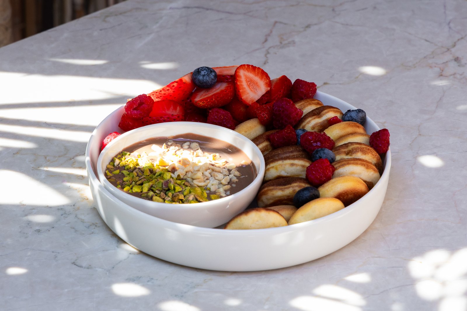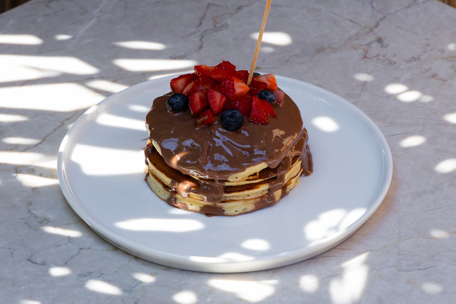 Kat kat ev yapımı pankekler, her katına dökülen sütlü çikolata ve aralara serpiştirilen taze çilek ile yaban mersini...