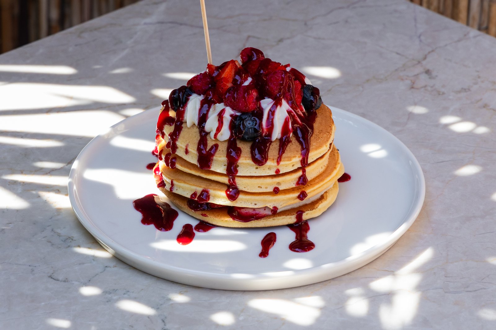 Her katında labneli özel kremasıyla hazırlanan yumuşacık ev yapımı pankekler, orman meyveli sosla buluşuyor. Üzerine serpiştirilen taze çilek ve yaban mersiniyle, ferah ve dengeli bir tatlı keyfi sunuyor.