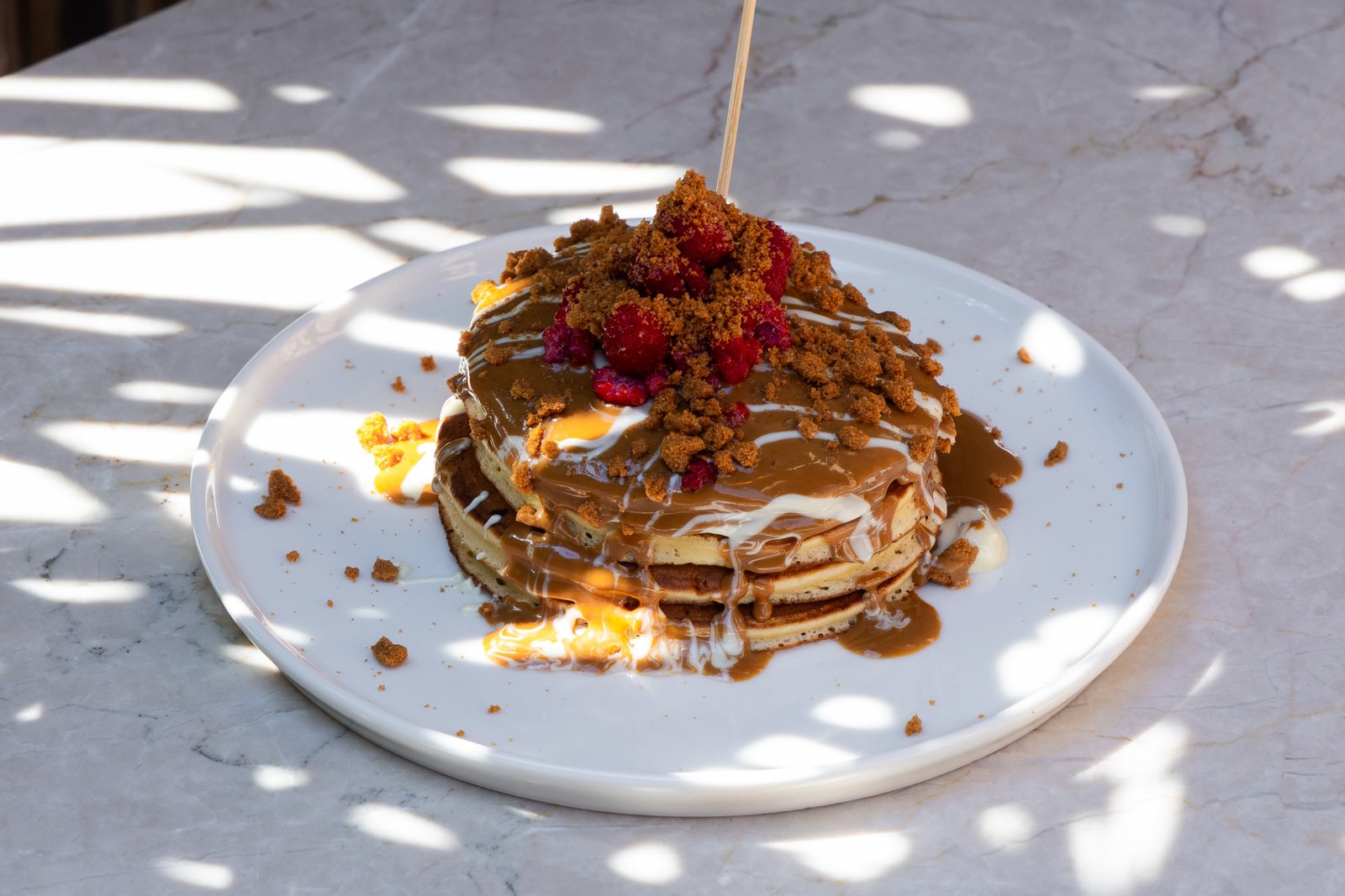 Ev yapımı yumuşacık pankeklerimizin üzerine bol Lotus çikolatası, kıtır Lotus bisküvi kırıntıları ve taze frambuazlarla hazırlanmış tatlı bir keyif. Her lokmada hem karamel hem meyve ferahlığı bir arada.
